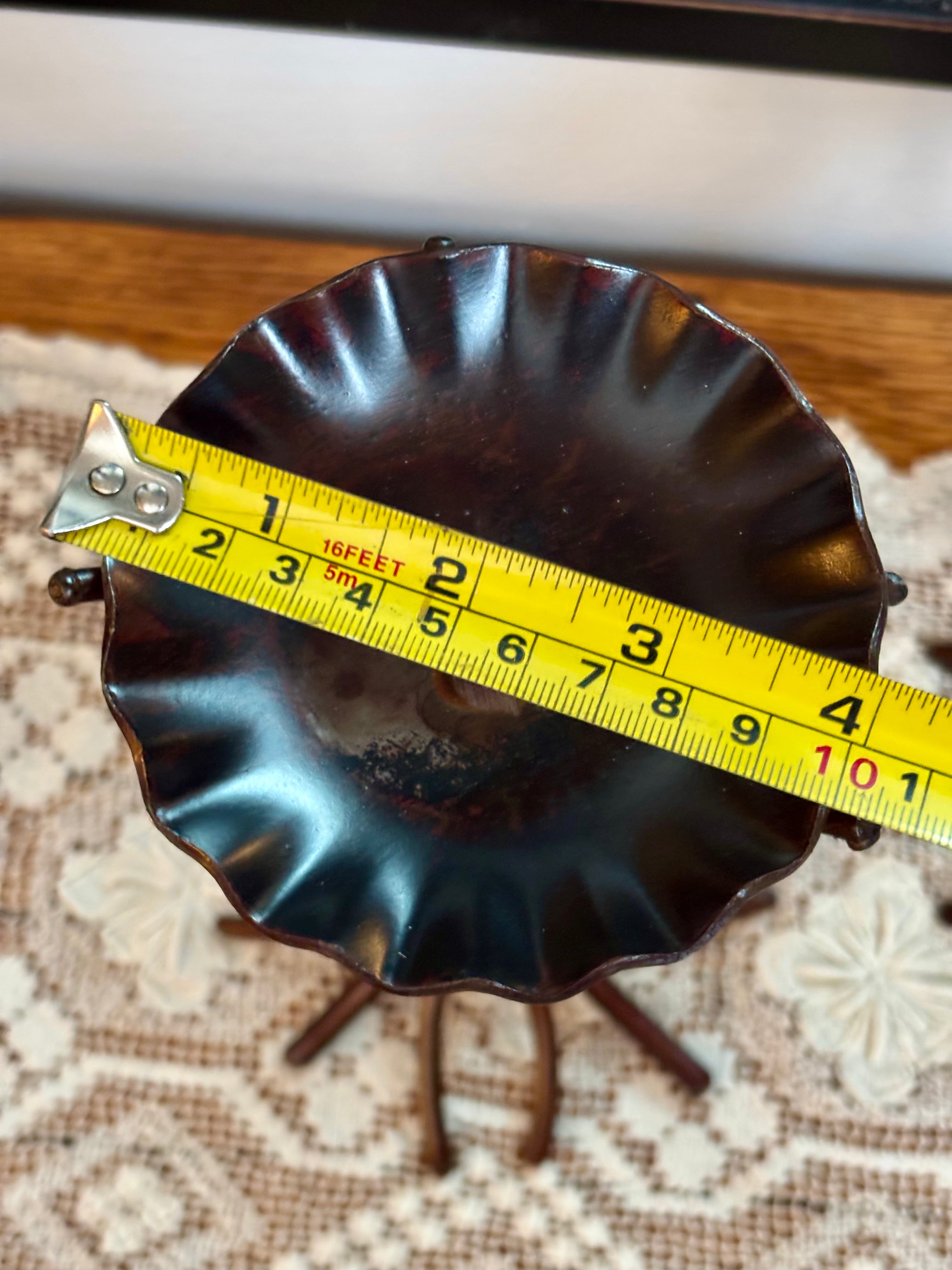 This sturdy three-tiered cake stand we originally designed for our oldest sons' engagement party 25 years ago. It has evolved in design and style into the current version, with steel vines, a bird and spaced to easily handle 14" cakes. Our trees are available in 48" height and 70" both with a rooted 18" heavy base, designed to display unique ornaments inside or out.