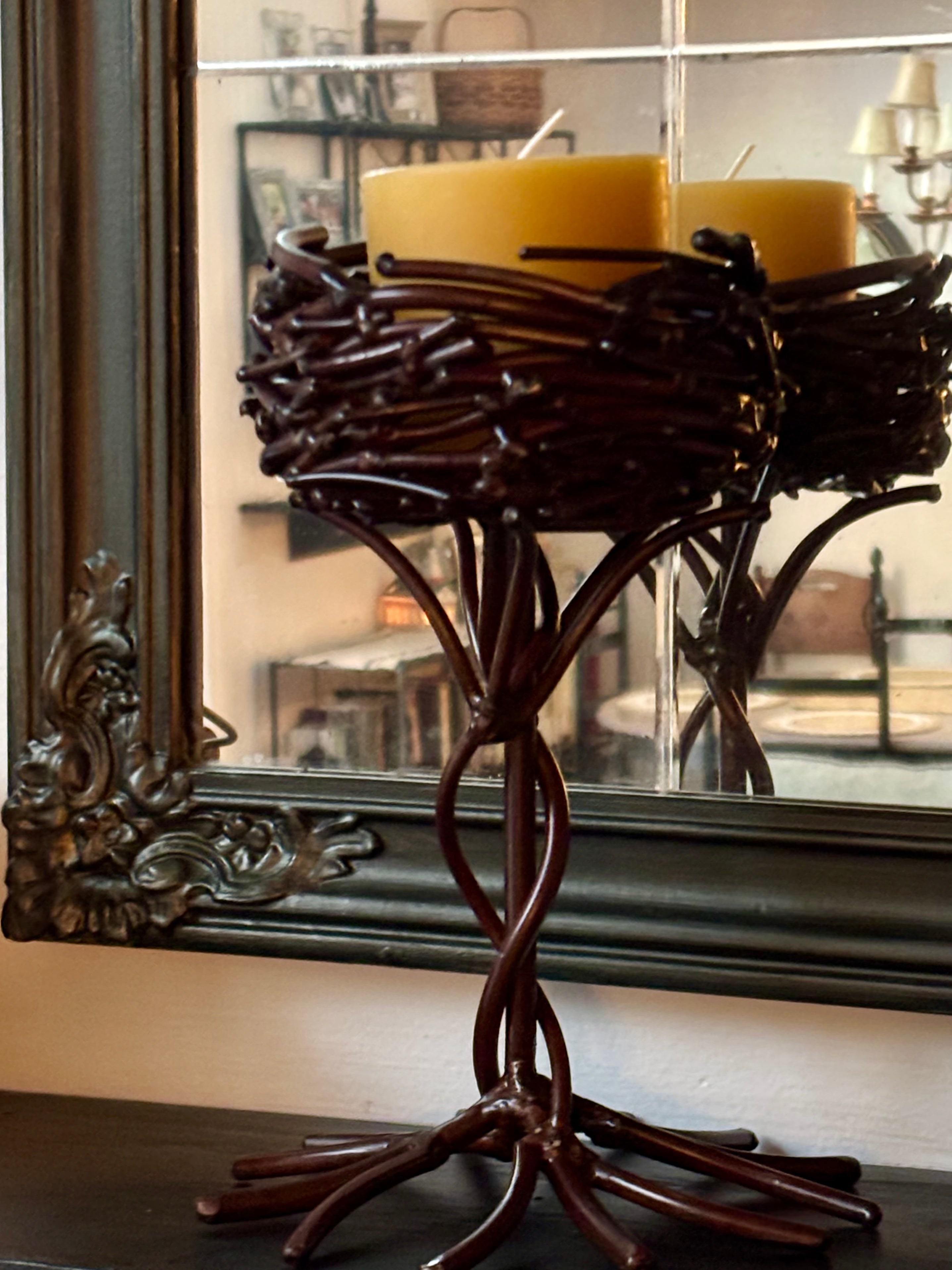 My wreath making began in 1980, from dried flowers, leading to fresh flowers for weddings and reception decor, now made of long-lasting steel. My hand drawn flowers, welded to our wreaths are hand painted in several colors. As the metal birds reflect our love for them, each piece displays birds as our signature.